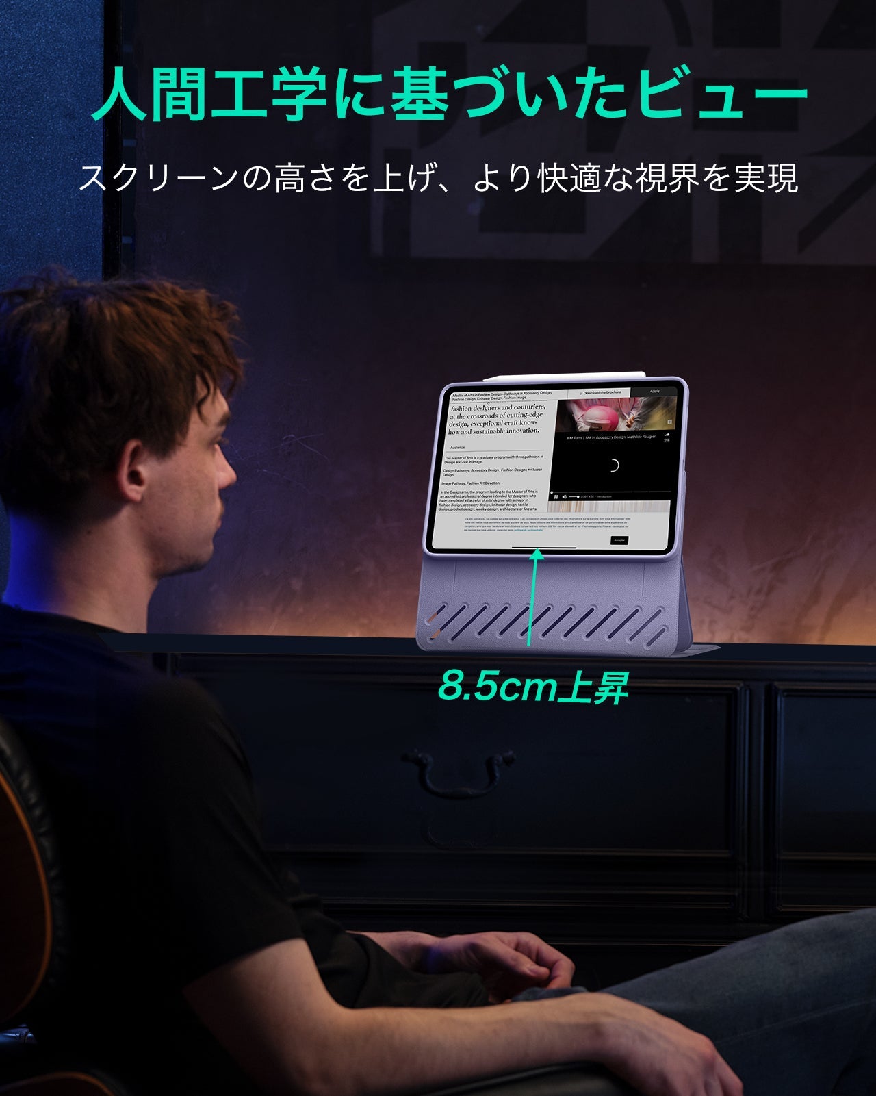 【画面の高さ調節機能】: iPad Proの画面をより自然な視線の高さに引き上げることで、長時間の使用でも姿勢を正しく保ち、快適に使用できます。